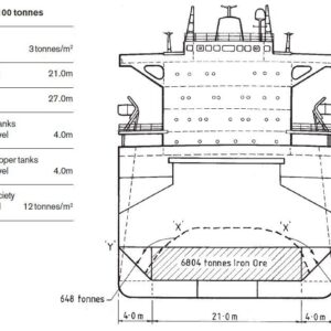 “When loading a high density bulk cargo having a stowage factor of about 0.56m3/t or lower, the loaded conditions are different from those found normally and it is important to pay particular attention to the distribution of weights so as to avoid excessive stresses. A general cargo ship is normally constructed to carry materials of about 1.39 to 1.67m3/t when loaded to full bale cubic and deadweight capacity. Because of the high density of some materials, it is possible by improper distribution of loading to stress very highly either the structure locally under the load or the entire hull.”