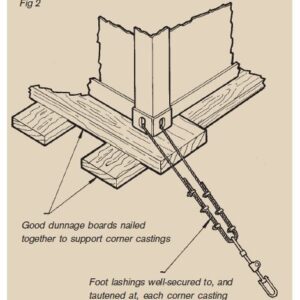 If circumstances demand a twin tier stack in the absence of footlocks or welded restraints, then properly rigged foot lashings should be used. The units must be twist locked together and lashed as indicated above. In such instances, the correct use of dunnage, both as to size and application, beneath the base corner castings, is of paramount importance, as illustrated in Fig 2 for instance.