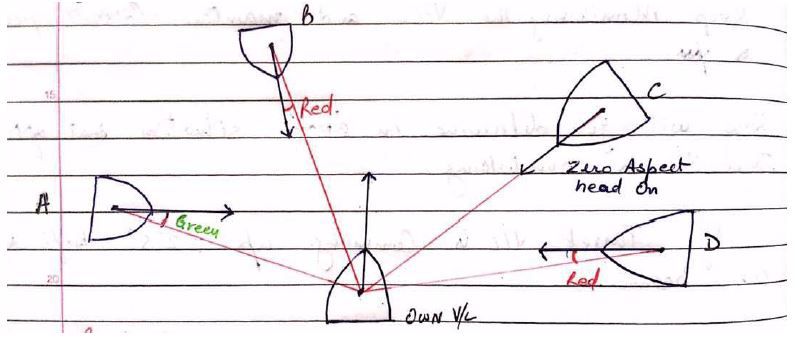 Angle “A” is Aspect angle of target ship. RED or GREEN