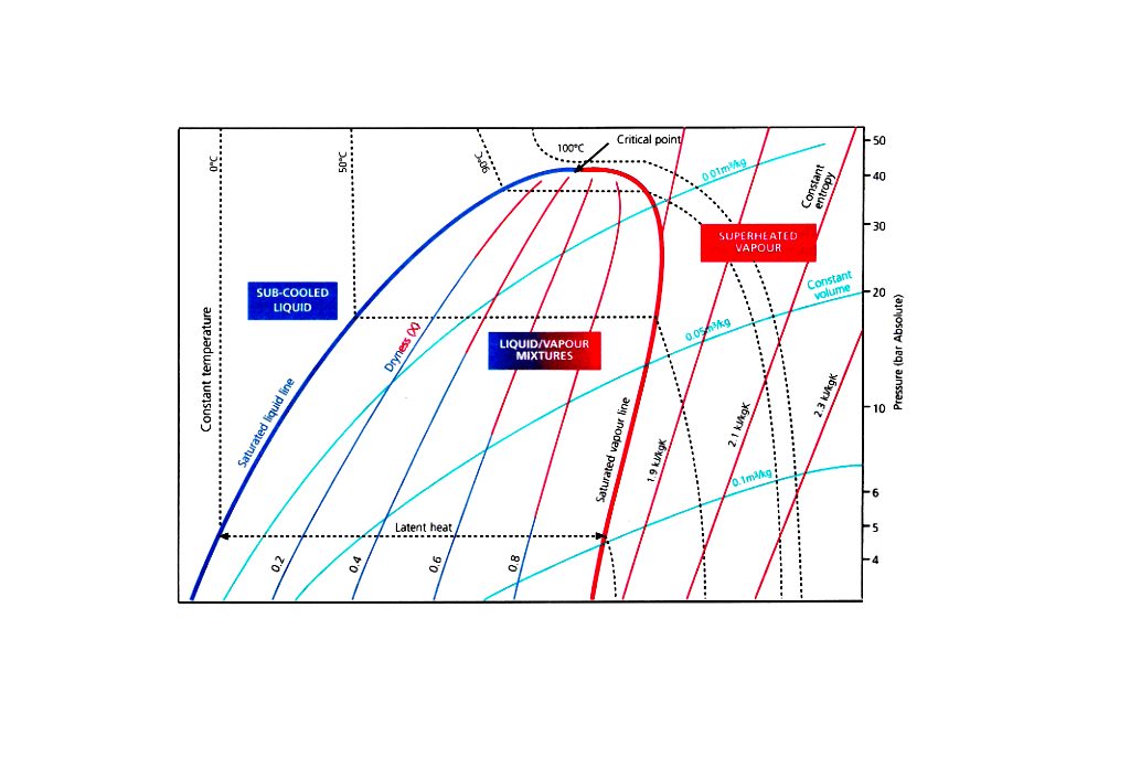 Diff in Enthalpy = 1076 kJ/kg (Vapour density = 0.880 kg/m3, heat per unit volume = 974 kJ/kg)