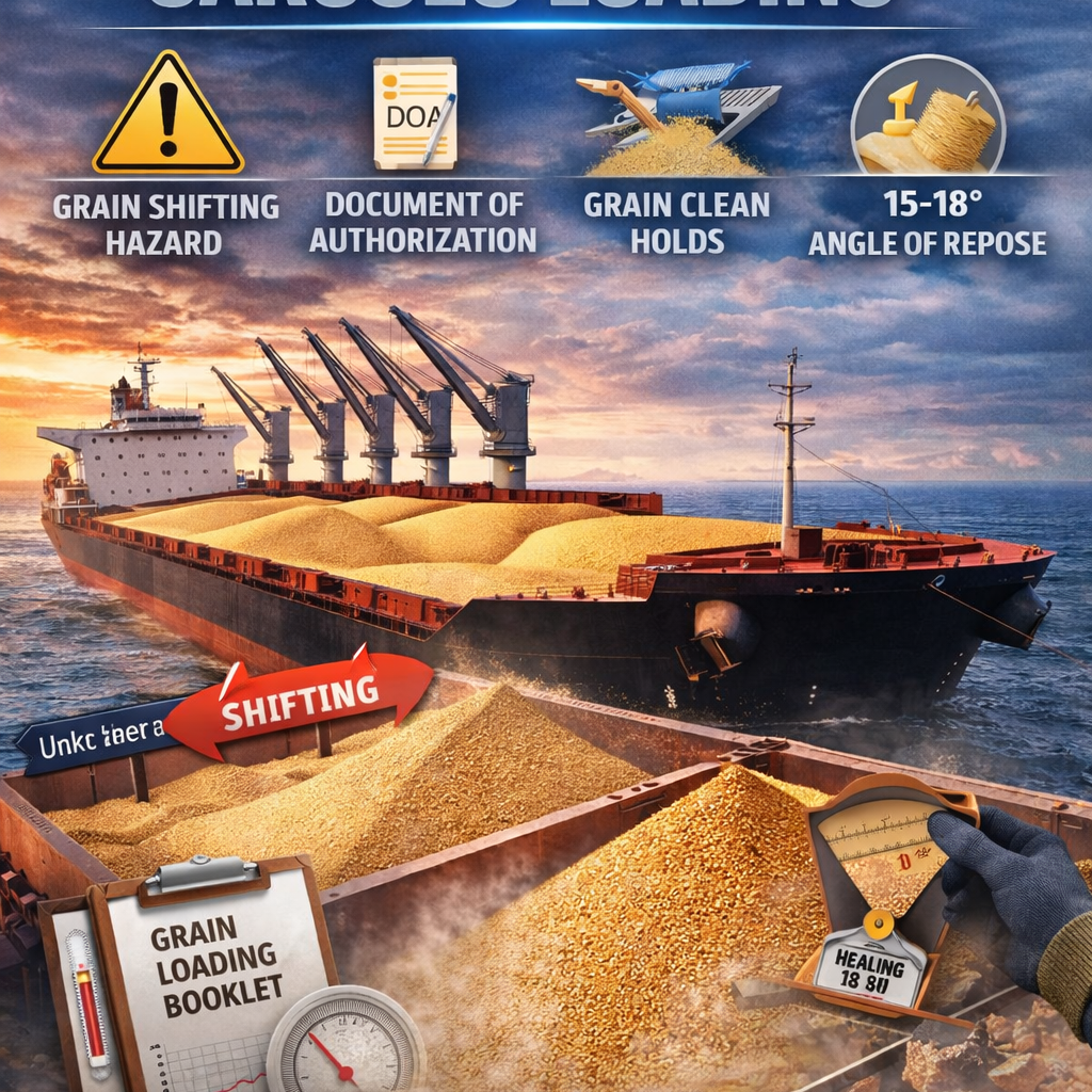 Grain settles by about 2% of its volume. Because of this settling, small void spaces that exist on the top of the grain surface in filled compartments increase in volume. These void spaces permit the grain to shift. The shifting of grain is the greatest hazard involved in the carriage of grain and all regulations contained in the International Code for the safe carriage of Grain in Bulk (1991) are directed towards limiting this shift of grain to within acceptable limits. This Code must always be referred to when loading grain.