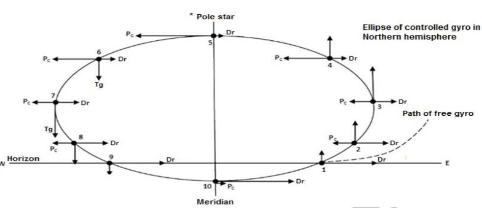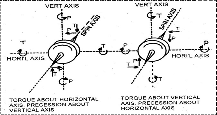 - Thus, on northerly course the gyro axle will apparently tilt north end up and causes the gyro to precess towards west and settles west of the meridian. Similarly, on southerly course the gyro will settle east.