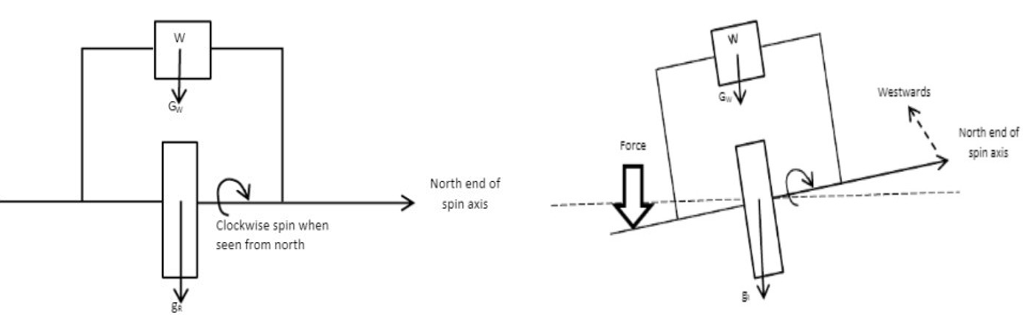 - If the gyro spin axis tilts up, when the earth rotates, the Gw and gR are no more in line and a force is applied to the south end of axis.