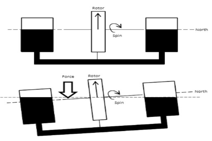 - When the gyro tilts, liquid flows between the north and south ends of the rotor under the influence of gravity.
