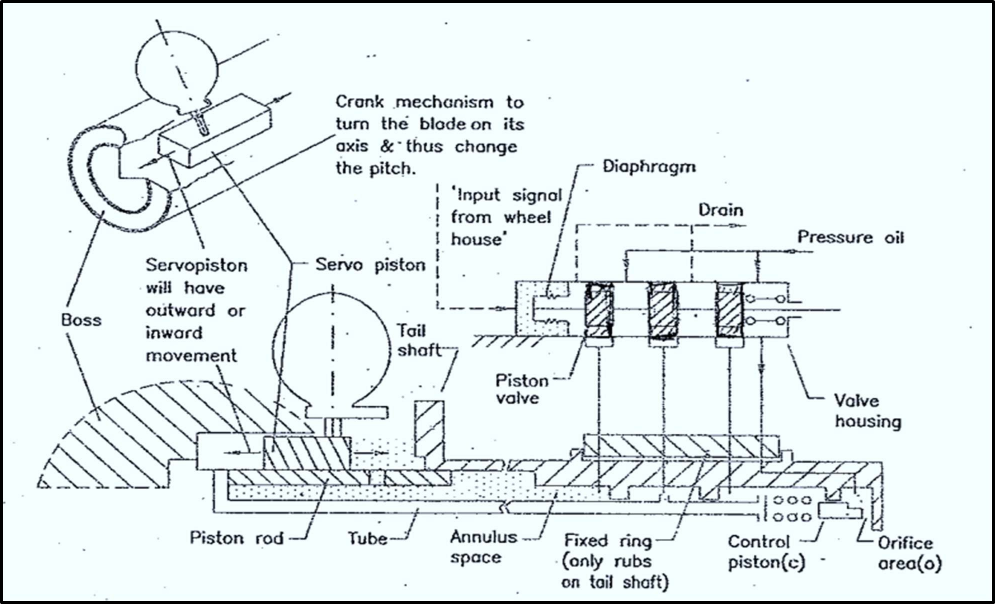 - Movement of the servo piston, through a crank, rotates blades and varies pitch.