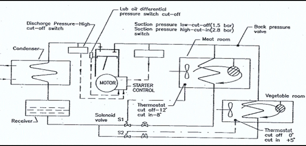 - Vapour pressure at compressor suction will increase and ‘suction pressure high’ (2.8 bar) switch will actuate the motor started and the motor will cut in.