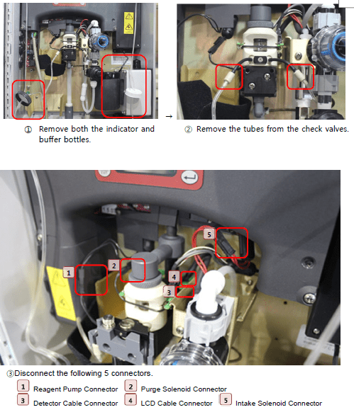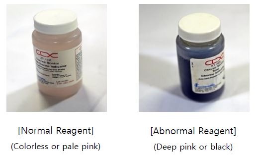 2) Regardless of the replacement cycle, if the indicator reagent is badly discoloured due to the malfunctioning of the cooling unit, replace the reagent as well as the cooling unit.