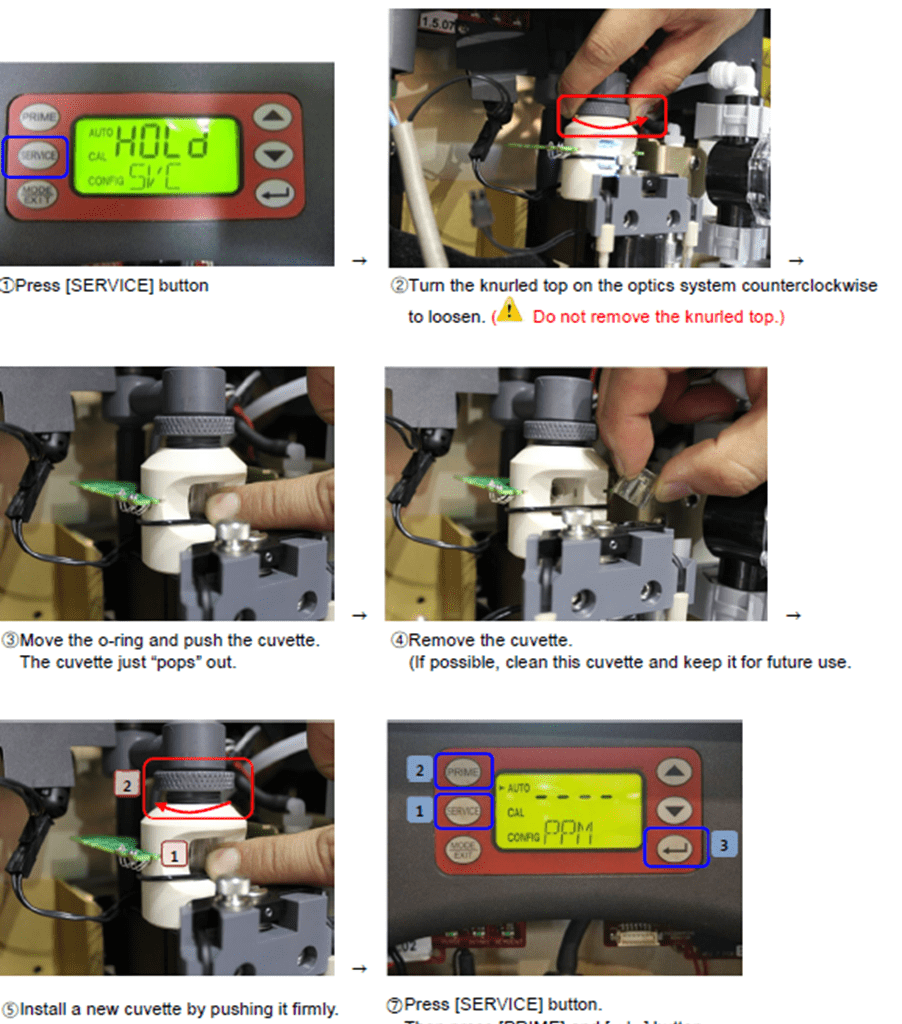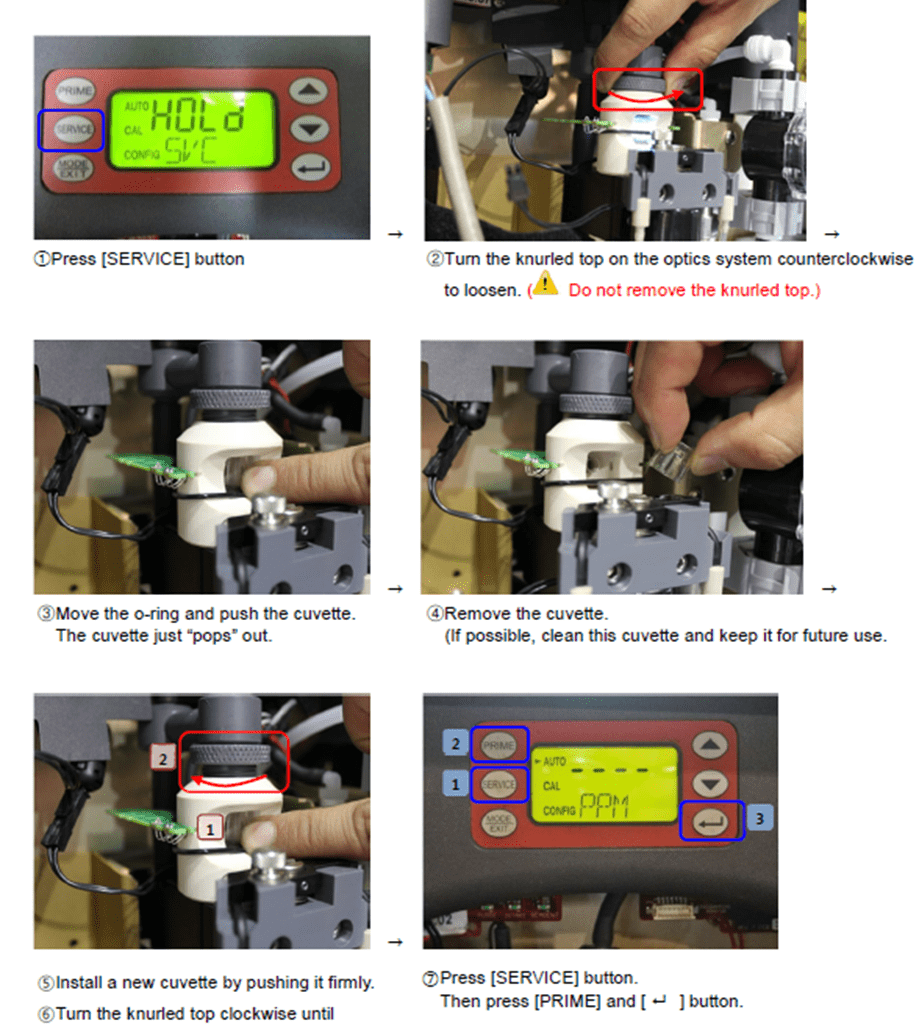 5. Check for any contamination on the cuvette. Clean or replace it as needed. If the cuvette appears badly soiled or discolored, replace it following the steps below.
