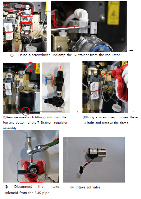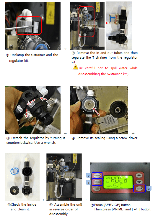 3. Check the T-strainer and the regulator. Clean or replace them if necessary.