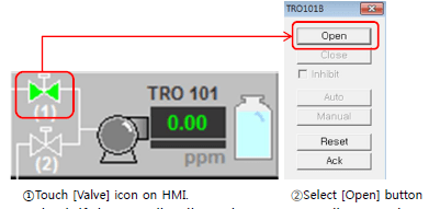 1) On the HMI, touch [Valve] icon on the suction line and select [Open] button on the popup window.