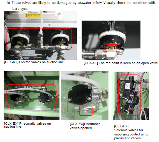 In the event of any trouble in the valve, repair or replace it. . Erosion due to seawater inflow may have caused such trouble. Visually check for it.