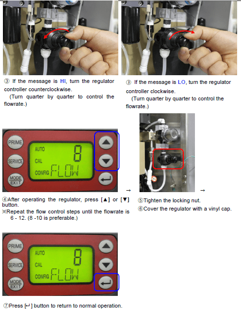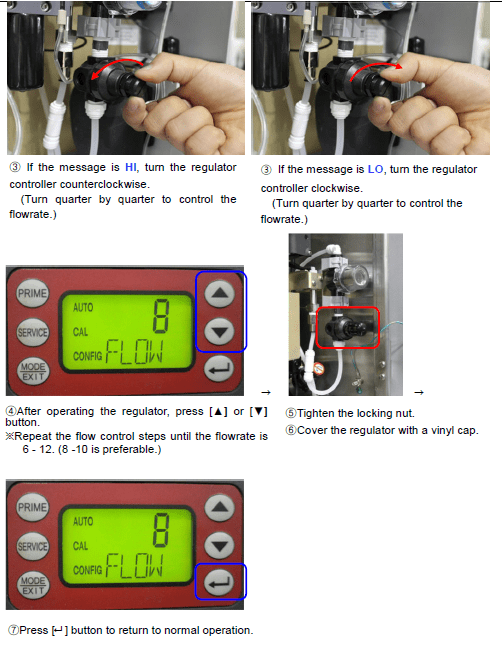 2. If the flowrate is [HI(1~5)] or [LO(13~ )], readjust it.