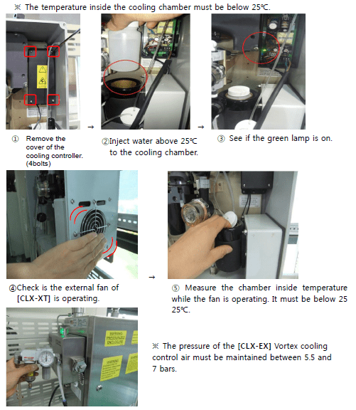 1 Inject warm water above 25. and check if the cooling fan is normally operating.